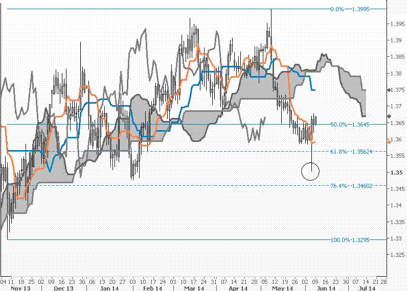 سفارشات خرید بعدی نیز در حدود سطوح ۱٫۳۵۸۵ و ۱٫۳۵۷۵ چیده شده اند و باید از این منطقه انتظار تقویت یورو لااقل در کوتاه مدت را داشت و در واقع این همان بهانه خرید به سوی سطح ۱٫۳۷۴۹ (خط آبی رنگ کیجون سن در چارت پایین) می تواند باشد که بازار به دنبال اوست.