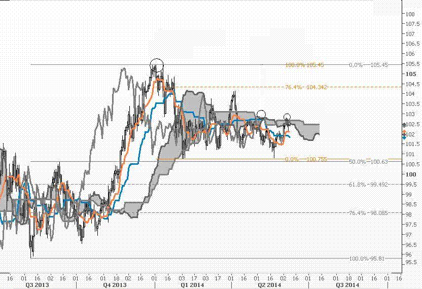 در این زوج ارز همانطور که در نمودار پایین مشاهده می نمائید، یک محدوده بسیار مهم در فاصله قیمتی ۱۰۲٫۸۰ تا ۱۰۳٫۰۰ وجود دارد که سقف ابر ایچیموکوی روزانه در این منطقه شکل گرفته است.