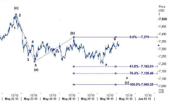 با این حال سه موج کوچک الیوت موج نزولی (c) را تشکیل خواهند داد و در نمودار زیر می بینیم که موج b به پیک خود رسیده و هم اکنون در موج نزولی c به سوی ۷۱۹۸ هستیم. سطح مقاومت نیز بر روی ۷۳۷۹ قرار گرفته است که تنها شکست این سطح موجب افزایش به سوی ۷۵۳۳٫۷۵ دلار/ تن می شود.