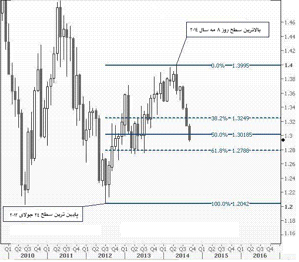 از نظر تحلیل تکنیکال در حرکت نزولی یورو در نمودار زیر مشخص است که قیمت به زیر نرخ ۱٫۳۰۱۸ (خط فیبوناچی ۵۰ درصدی از ۱٫۲۰۴۲ به ۱٫۳۹۹۵) سقوط کرده که این شکست می تواند برای روزها و هفته های آینده مقدمه ای برای فرود بیشتر یورو تا هدف ۱٫۲۷۸۸ (خط فیبوناچی ۶۱٫۸ درصدی) و در ادامه تا سطح ۱٫۲۷۵۰ باشد.