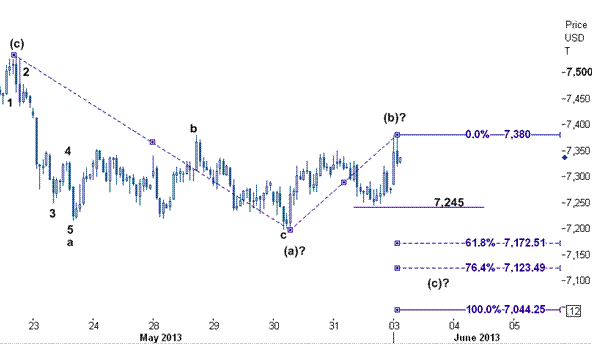 در هر صورت نفوذ قیمت به بالای سطح ۷۳۷۹ موجب تایید از سرگیری روند صعودی آغاز شده از سطح ۷۴۵۰ به سوی ۷۵۳۳٫۷۵ ( بالاترین سطح روز ۲۲ مه ) می باشد و این در حالی است که کاهش قیمت به زیر سطح ۷۲۴۵ موجب تایید ادامه سیر نزولی آغاز شده از سطح ۷۵۳۳٫۷۵ به سوی ۷۱۷۳ ( سطح فیب ۶۱٫۸ درصدی ) از موج نزولی (c) خواهد شد.
