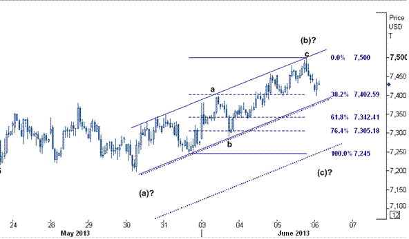 تحلیل و بررسی امواج الیوت نیز نشان می دهد که حرکت افزایشی اخیر از سطح ۷۱۹۸ ( پایین ترین سطح روز ۳۰ مه ) در موجهای اصلاحی شکل گرفته است و این امواج از دوام چندانی برخوردار نیست و همانطور که در چارت پایین ملاحظه می شود کاهش اخیر از سطح ۷۵۰۰ سرآغاز موج نزولی (c) می باشد که به احتمال زیاد در طی روزهای آتی تا سطح ۷۱۹۸ دلار/ تن کاهش خواهد یافت.