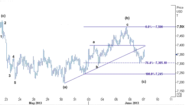 این حرکت کاهشی در موج نزولی (c) صورت گرفته است که سومین موج از چرخه سه موجی شروع شده از سطح ۷۵۳۳٫۷۵ ( بالاترین سطح روز ۲۲ مه ) می باشد. سطح حمایت نیز در اطراف ۷۳۰۵ ( فیب ۷۶٫۴ درصدی از افزایش ۷۲۴۵ به ۷۵۰۰ ) قرار دارد.
