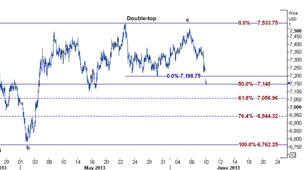 این الگو همانگونه که در چارت زیر مشاهده می شود از اطراف بالاترین سطح روز ۲۲ مه یعنی سطح ۷۵۳۳٫۷۵ با خط گردن بر روی نرخ ۷۱۹۸٫۷۵ تشکیل شده است. بر اساس اختلاف قیمتی بین یکی از نقاط سقف و خط گردن می بایست منتظر کاهش قیمت مس به زیر سطح ۶۹۴۴ ( سطح فیب ۷۶٫۴ درصدی از افزایش ۶۷۶۲٫۲۵ به ۷۵۳۳٫۷۵) باشیم .