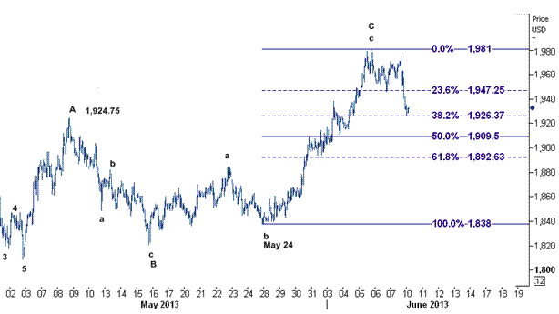 در چارت پایین کاملا مشخص است که سطح حمایت بر روی خط فیب ۳۸٫۲ درصدی از افزایش ۱۸۳۸ ( پایین ترین سطح روز ۲۴ مه ) به ۱۹۸۱ ( بالاترین سطح روز ۵ ژوئن ) تشکیل شده است. به احتمال زیاد در اطراف این سطح شاهد توقف کاهش قیمت باشیم. قبلا نیز سطح حمایت ۱۹۴۷ ( فیب ۲۳٫۶ درصدی ) از کاهش قیمت جلوگیری می کرد که البته هم اکنون شکسته شده است و می بایست منتظر کاهش بیشتر باشیم.