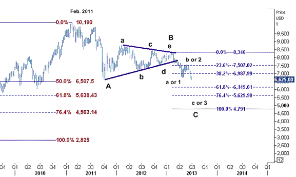 تحلیل قبلی همچنان به قوت خود پایدار و معتبر است و در نمودار قیمت جهانی مس در بازار بورس فلزات لندن براساس آنچه که قبلا گفتیم ، پیش بینی می کنیم که قیمت آن در طی ۱ الی ۳ ماهه آینده تا سطح ۶۱۴۹ دلار/ تن سقوط کند که این هدف را موج نزولی C تایید می نماید و حتی ممکن است با شکست این سطح تا نرخ ۵۶۳۰ دلار کاهش یابد. این موج نزولی همانطور که در نمودار زیر مشخص است از سطح ۸۳۴۶ ( بالاترین سطح روز ۴ فوریه ) شروع شده است .