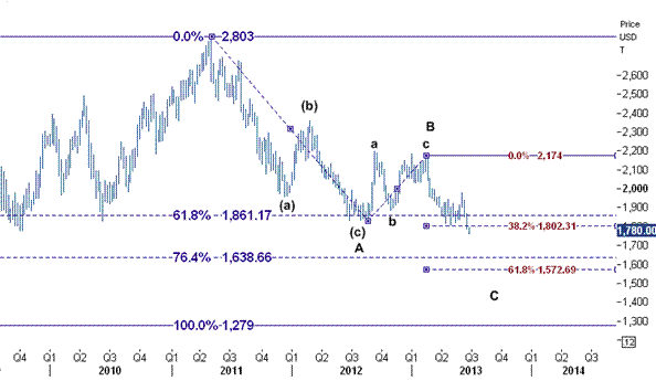 تحلیل قبلی برای قیمت آلومینیم آلیاژی در بازار بورس فلزات لندن نیز همچنان مورد توجه بازار است و همانطور که اشاره کردیم ، پیش بینی می کنیم که قیمت آن در طی ۱ الی ۳ ماهه آینده تا محدوده ۱۶۳۹ الی ۱۵۷۳ دلار/تن کاهش یابد که این حرکت را بررسی امواج الیوت و سطوح فیبوناچی تایید کرده است. در نمودار زیر همانطور که ملاحظه می فرماید قیمت در موج نزولی C قرار دارد که در موج بلند مدت نزولی از سطح ۲۸۰۳ دلار ( بالاترین سطح ماه مه ۲۰۱۱) قرار گرفته است.