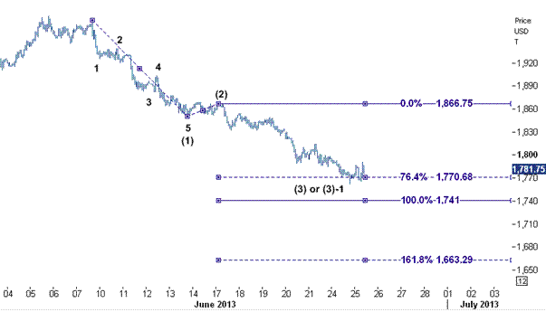 هر چند موج کاهشی قیمت از سطح ۱۹۸۱ ( بالاترین سطح روز ۵ ژوئن ) خیلی سریع و شتاب نزولی آن تند بوده است اما بعید به نظر می رسد که شاهد هر گونه حرکت اصلاحی افزایشی بزرگ به نرخهای بالا باشیم زیرا در نمودار دوم قیمت آلومینیم در موج نزولی (۳) یا موج ۱ – (۳) در حال تنزل است.