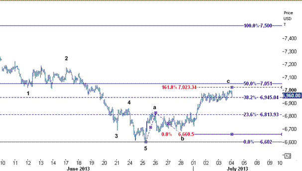 کاملا مشخص است که این حرکت برگشتی در سه موج شکل گرفته است که موج سوم یعنی موج c پس از شکست سطح مقاومت ۶۹۴۵ ( خط فیب ۳۸٫۲ درصدی از ۷۵۰۰ به ۶۶۰۲) وارد منطقه اشباع از خرید (Overbought) شده است و برای امروز به محض نفوذ قیمت به زیر سطح ۶۹۱۰ می بایست در انتظار کاهش قیمت به سطح ۶۸۱۴ ( بر روی خط فیب ۲۳٫۶ درصدی ) باشیم که در نمودار زیر مشخص است.