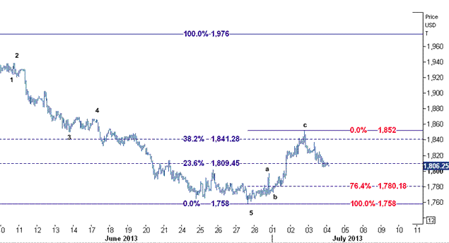 این حرکت بازگشتی از سطح ۱۷۵۸ ( پایین ترین سطح روز ۲۷ ژوئن ) در سه موج در قالب موجهای a , b , c تشکیل شده است و موج کنونی به سوی کف موج b در حال کاهش است که اندکی پایین تر از سطح ۱۷۸۰ ( خط فیبوناچی ۷۶٫۴ درصدی از ۱۷۵۸ به ۱۸۵۲) می باشد.