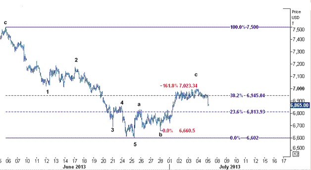 با در نظر گرفتن این موضوع که حرکت کاهشی از سطح ۷۵۰۰ می تواند به پنج موج تقسیم شود ، بنابراین هدف های پایین ۶۶۰۲ را نمایان خواهد ساخت. البته برای امروز هدف واقع بینانه ما کاهش به سوی سطح ۶۶۶۰٫۵۰ دلار می باشد که کف موج قبلی b و پایین ترین سطح لمس شده در روز ۲۸ ژوئن می باشد.