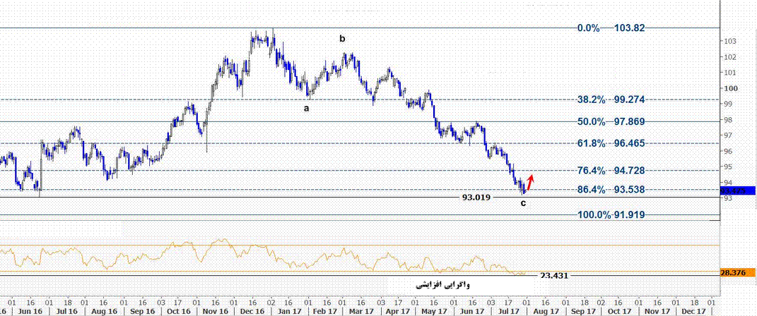 این سطح بر روی خط فیبوناچی ریتریسمنت ۸۶٫۴ درصدی از موج افزایشی ۹۱٫۹۱ (پایین ترین سطح ۳ مه ۲۰۱۶) به ۱۰۳٫۸۲ (بالاترین سطح ۳ ژانویه ۲۰۱۷) تشکیل شده و این سطح در نزدیکی ۹۳٫۰۱ (پایین ترین سطح ۲۳ ژوئن ۲۰۱۶) قرار دارد و این محدوده را به حمایت مهم برای شاخص دلار آمریکا تبدیل کرده است. باید توجه داشت واحدهای پولی که در شاخص دلار آمریکا وجود دارند عبارتند از یورو ۵۷.۶٪ ، ین ژاپن ۱۳.۶٪ ، پوند انگلیس ۱۱.۹٪ ، دلار کانادا ۹.۱٪ ، کرون سوئد ۴.۲٪ و فرانک سوئیس ۳.۶٪.