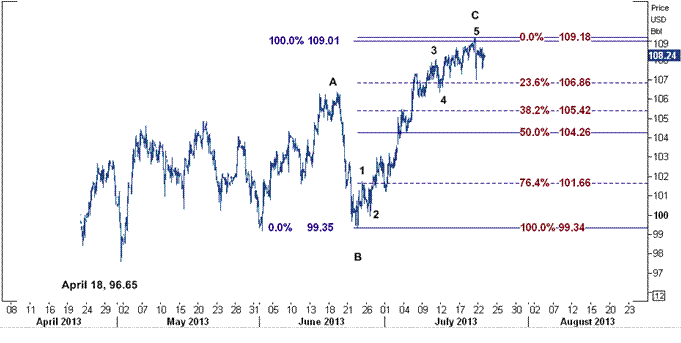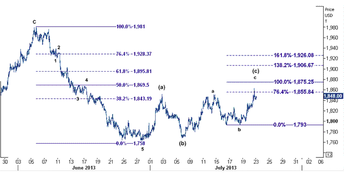 با نگاهی به نمودار پایین می توان متوجه شد که از نظر امواج الیوت ، این سومین موج از موج بزرگ (c) می باشد که از سطح ۱۷۶۸٫۵۰ ( پایین ترین سطح روز ۵ جولای) شروع شده است.