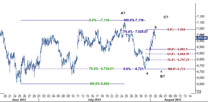 برای قیمت جهانی مس در بازار بورس فلزات لندن پیش بینی می کنیم که امروز قیمت آن به منطقه ۶۸۸۳ و ۶۸۴۴ دلار/تن کاهش یابد که این تارگت را بررسی سطوح فیبوناچی تایید کرده است. به باور ما موج افزایشی قبلی که از سطح ۶۷۲۱ ( پایین ترین سطح روز ۳۰ جولای) شروع شده بود در همان منطقه نزدیکی ۷۰۲۵ ( بر روی خط فیبوناچی ۷۶٫۴ درصدی از کاهش ۷۱۱۹ – بالاترین سطح روز ۲۴ جولای – به ۶۷۲۱) به سقف و پیک قیمتی خود رسیده است.