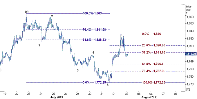 در نمودار زیر می بینیم که حرکت برگشتی قیمت از سطح ۱۷۷۲٫۲۵ در منطقه مقاومت ۱۸۲۸ و ۱۸۴۲ متوقف شده است که این منطقه به ترتیب بر روی خط فیبوناچی ۶۱٫۸ درصدی و ۷۶٫۴ درصدی از کاهش ۱۸۶۳ ( بالاترین سطح روز ۲۲ جولای) به ۱۷۷۲٫۲۵ قرار گرفته اند.
