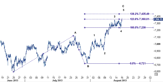 در چارت زیر کاملا به وضوح مشخص است که از منظر تحلیل و بررسی امواج الیوت این موج C از پنج ریز موج کوچک در قالب موجهای ۱٫۲٫۳٫۴٫۵ تشکیل شده است و موج ۵ در حال افزایش قیمت به سوی ۷۴۳۵ می باشد که این سطح بر روی خط فیبوناچی ۱۳۸٫۲ درصدی قرار گرفته است.