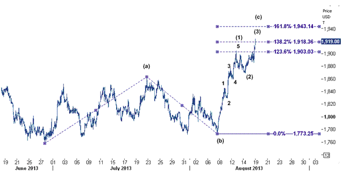 این روند همانطور که در نمودار زیر مشاهده می شود در موج افزایشی (c) تشکیل شده است که در عبور از سطح مقاومت ۱۹۱۸ (بر روی خط فیبوناچی ۱۳۸٫۲ درصدی) موفق بوده است و از این رو مقاومت بعدی بر روی منطقه ۱۹۴۳ ( سطح فیبوناچی ۱۶۱٫۸ درصدی) قرار خواهد گرفت.