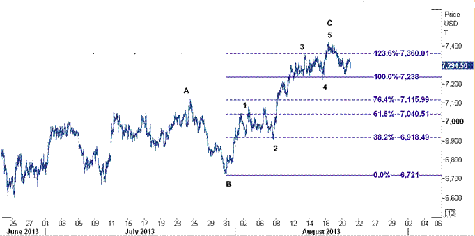 در نمودار زیر کاملا به وضوح مشخص است حرکت سه موجی قیمت که از سطح ۶۶۰۲ ( پایین ترین سطح روز ۲۵ ژوئن) شروع شده در اطراف سطح ۷۴۲۰ ( بالاترین سطح روز ۱۶ اوت) به سقف و پیک قیمتی خود رسیده است و در طی چند روز آینده حتی ممکن است تا کف موج دوم یعنی سطح ۶۷۲۱ ( پایین ترین سطح روز ۳۰ جولای) کاهش قیمت داشته باشد.
