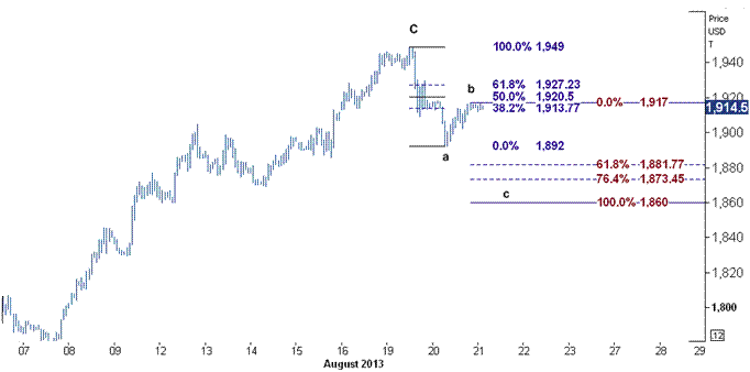 در نمودار زیر مشخص است که موج نزولی c شروع شده و می تواند قیمت را حتی تا سطح ۱۸۸۲ ( بر روی خط فیبوناچی ۶۱٫۸ درصدی) پایین بکشاند.