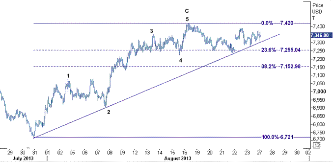 در نمودار زیر کاملا به وضوح مشخص است که خط روند رسم شده بر روی سطح ۷۳۰۰ مورد حمایت قرار گرفته است و چنانچه قیمت به زیر این سطح برسد منجر به تضعیف قیمت مس به سطح ۷۲۵۵ دلار/تن ( بر روی خط فیبوناچی ۲۳٫۶ درصدی از افزایش ۶۷۲۱ به ۷۴۲۰ ) خواهد شد.