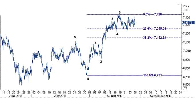 در حقیقت این منطقه خنثی همانطور که در نمودار زیر مشخص است بین بالاترین سطح روز ۱۶ اوت و خط فیبوناچی ۲۳٫۶ درصدی از افزایش ۶۷۲۱ به ۷۴۲۰ قرار گرفته است و هنوز قیمت نتوانسته است که از این منطقه خنثی عبور کند.