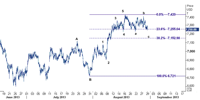 این منطقه خنثی و باریک همانطور که دیروز گفته شد بین بالاترین سطح روز ۱۶ اوت و خط فیبوناچی ۲۳٫۶ درصدی از افزایش ۶۷۲۱ ( پایین ترین سطح روز ۳۰ جولای) به ۷۴۲۰ تشکیل شده است و بررسی اموج الیوت نشان می دهد که در موج c قیمت مس در حال ریزش به سوی سطح ۷۱۵۳ ( بر روی خط فیبوناچی ۳۸٫۲ درصدی) می باشد.