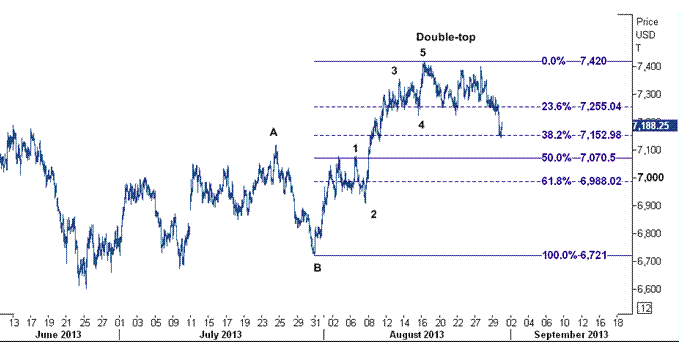 این حرکت برگشتی پس از برخورد قیمت به سطح حمایتی که بر روی سطح فیب ۳۸٫۲ درصدی از افزایش ۶۷۲۱ (پایین ترین سطح روز ۳۰ جولای) به ۷۴۲۰ (بالاترین سطح روز ۱۶ اوت ) شکل گرفته بود قرار گرفته است و همانطور که در نمودار زیر می بینید سقف دو قلو تایید شده است که هدف ۷۰۷۱ ( خط فیبوناچی ۵۰ درصدی) را نشانه گرفته است.