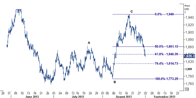 همانگونه که در نمودار زیر مشاهده می کنید این سطح حمایت بر روی خط فیبوناچی ۶۱٫۸ درصدی از افزایش ۱۷۷۳٫۲۵ ( پایین ترین سطح روز ۷ اوت) به ۱۹۴۹ ( بالاترین سطح روز ۱۹ اوت) قرار گرفته است و برای امروز هر گونه حرکت افزایشی به بالای ۱۸۴۵ موجب مردود شدن شکست سطح ۱۸۴۱ می شود و آن وقت می بایست در سناریوی نزولی به سطح ۱۸۱۵ موقتا تجدید نظر کرد.